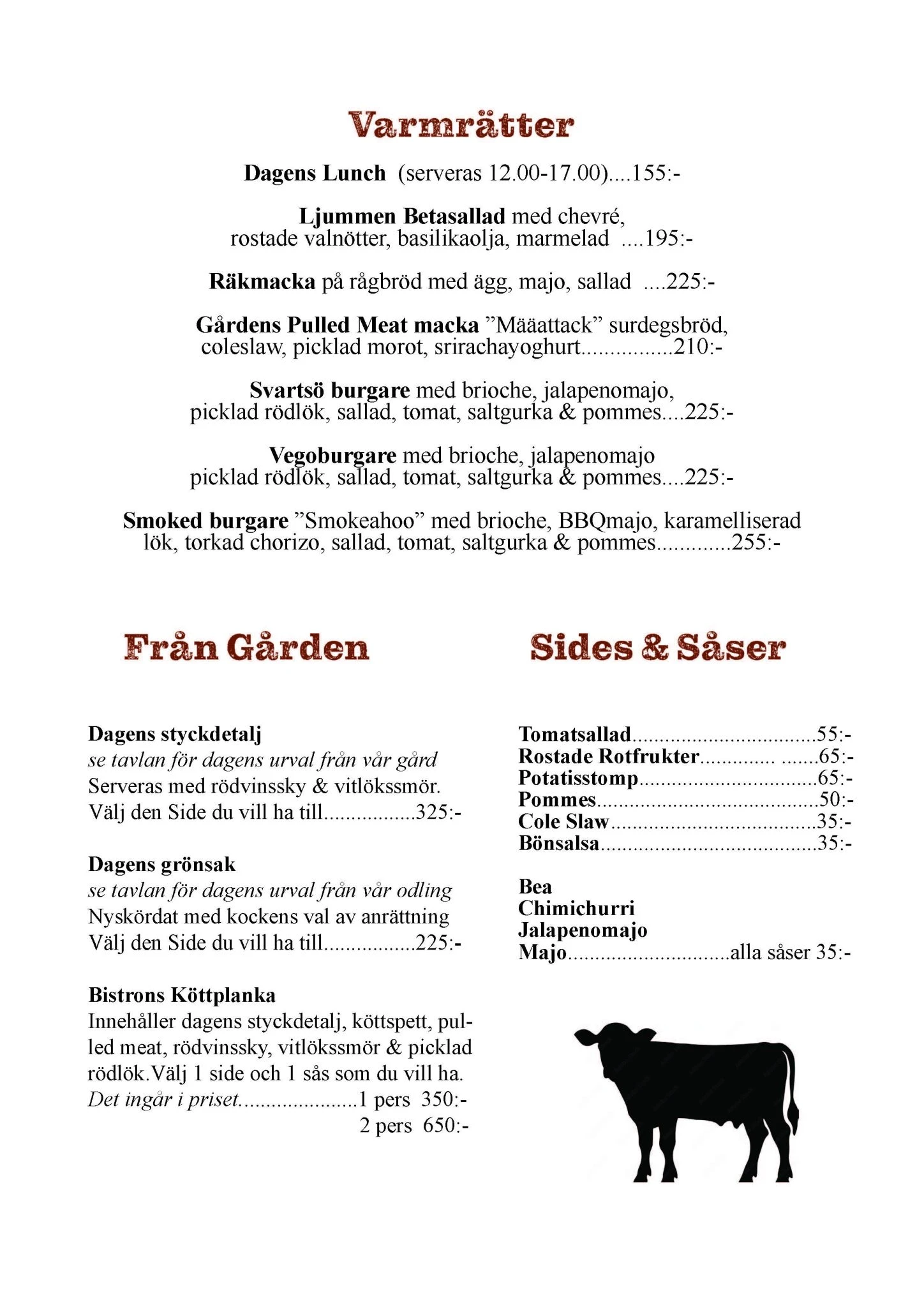Bistro Sågen låter årstiderna styra menyn. Vi serverar rätter som följer naturens rytm och tar tillvara på det som växer och föds upp i vår närhet. En stor del av råvarorna kommer från vår egen gård och från producenter i skärgården, vilket gör att menyn förändras efter säsong och tillgång. Hos oss kan du njuta av allt från enkla förrätter och vällagade husmansklassiker till grillrätter, burgare och hemlagade desserter.